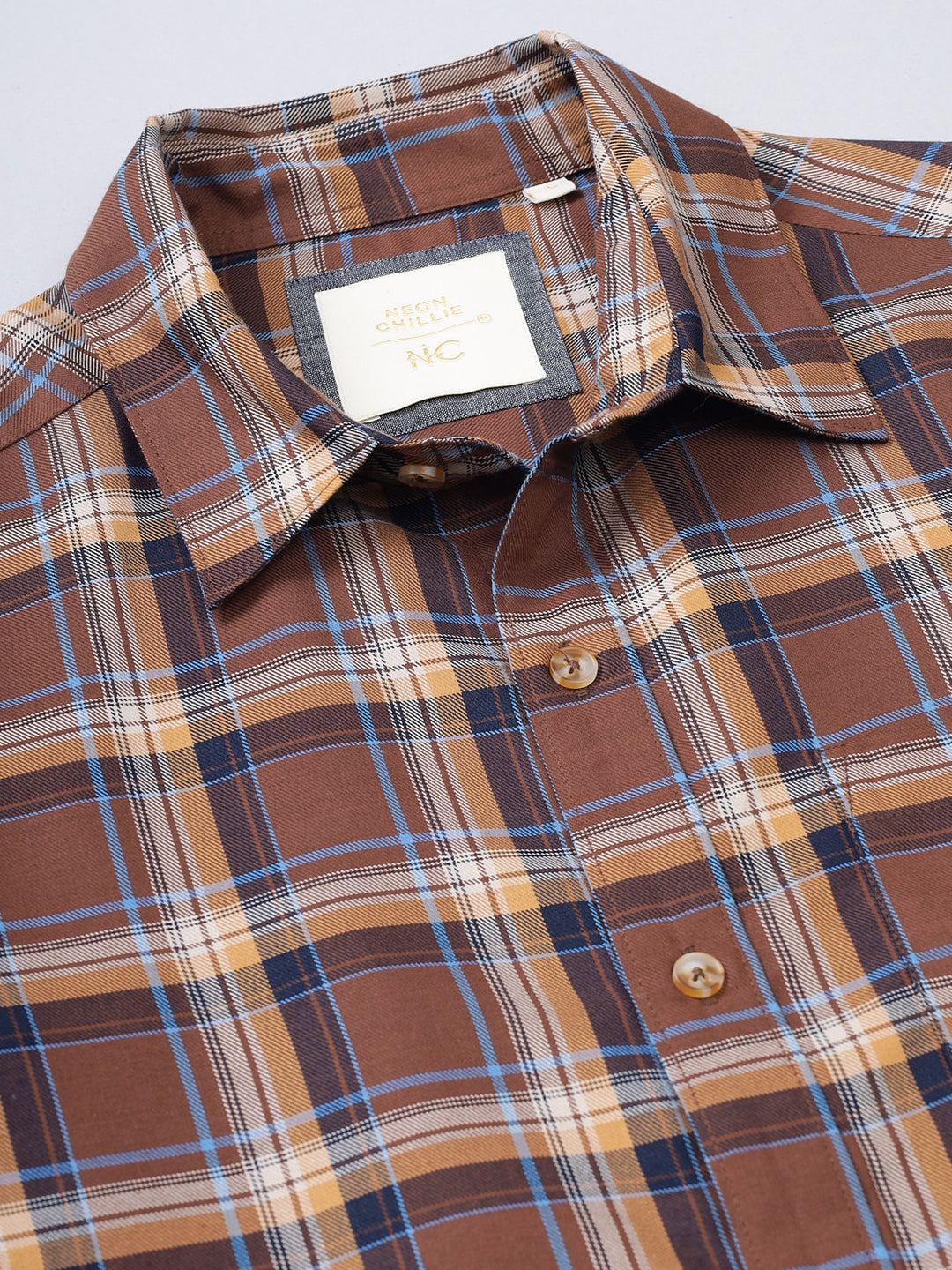 Men Brushed Flannel Brown, Navy and Sky Blue Checkered Classic Fit Smart Casual Shirt