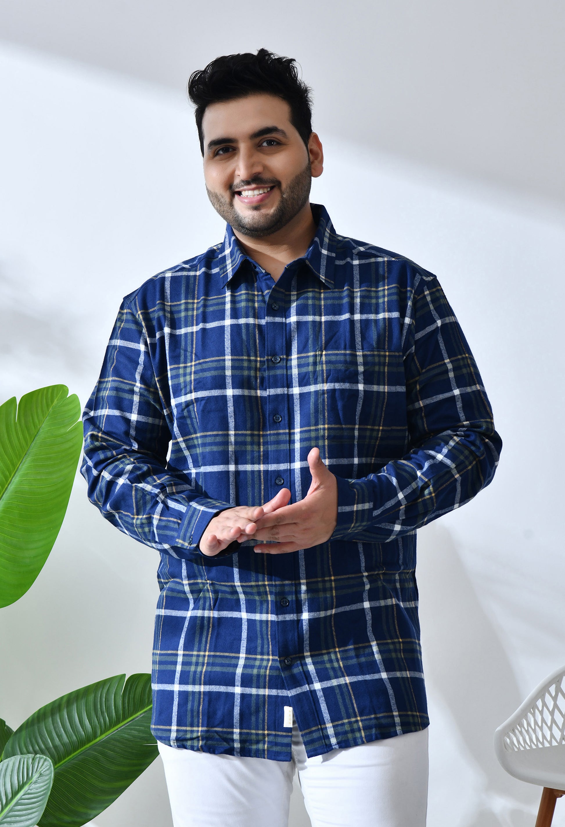 Men Brushed Flannel Navy, Yellow and White Checkered Classic Fit Pocket Smart Casual Shirt