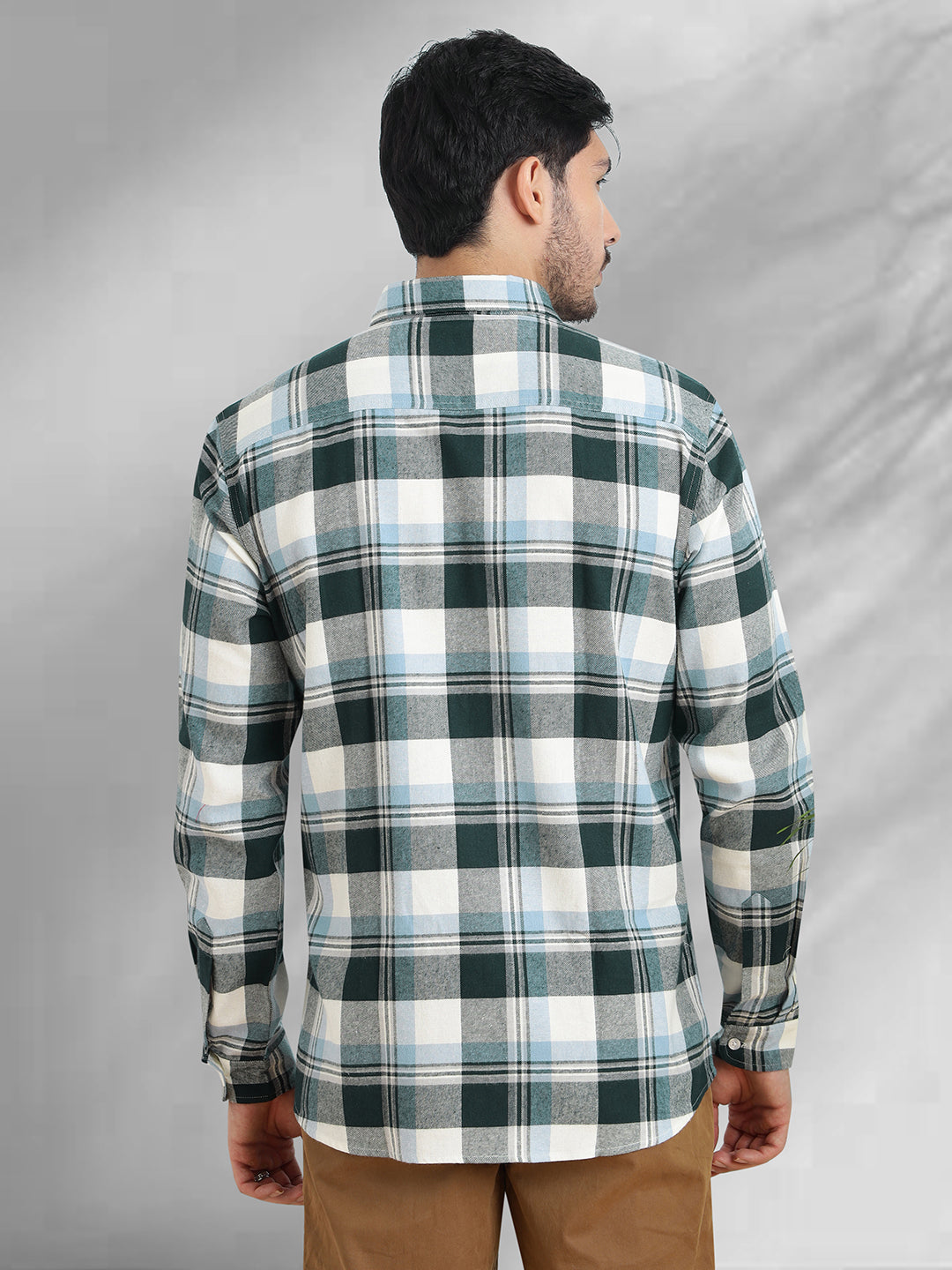 Men Brushed Flannel Sky Blue, Green and White Checkered Classic Fit Smart Casual Shirt