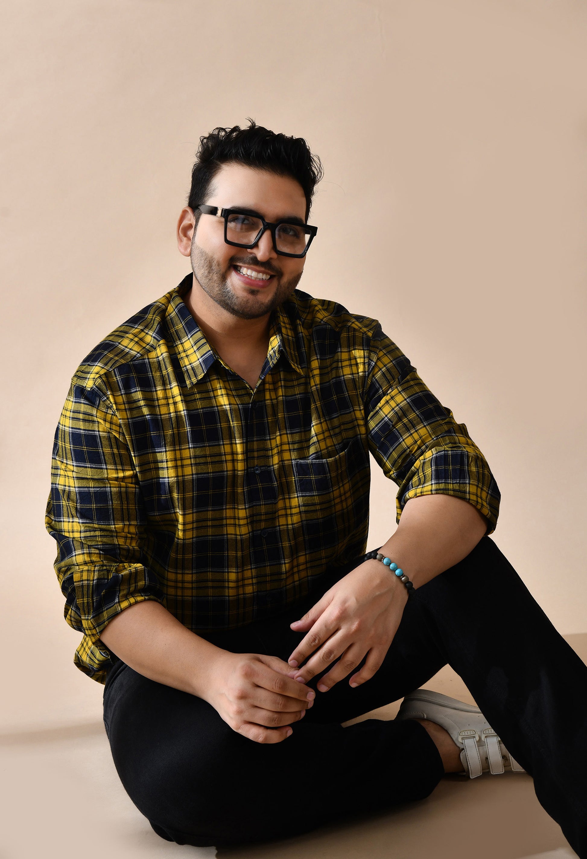 Men Brushed Flannel Yellow Black and White Checkered Classic Fit 1 Pocket Smart Casual Shirt