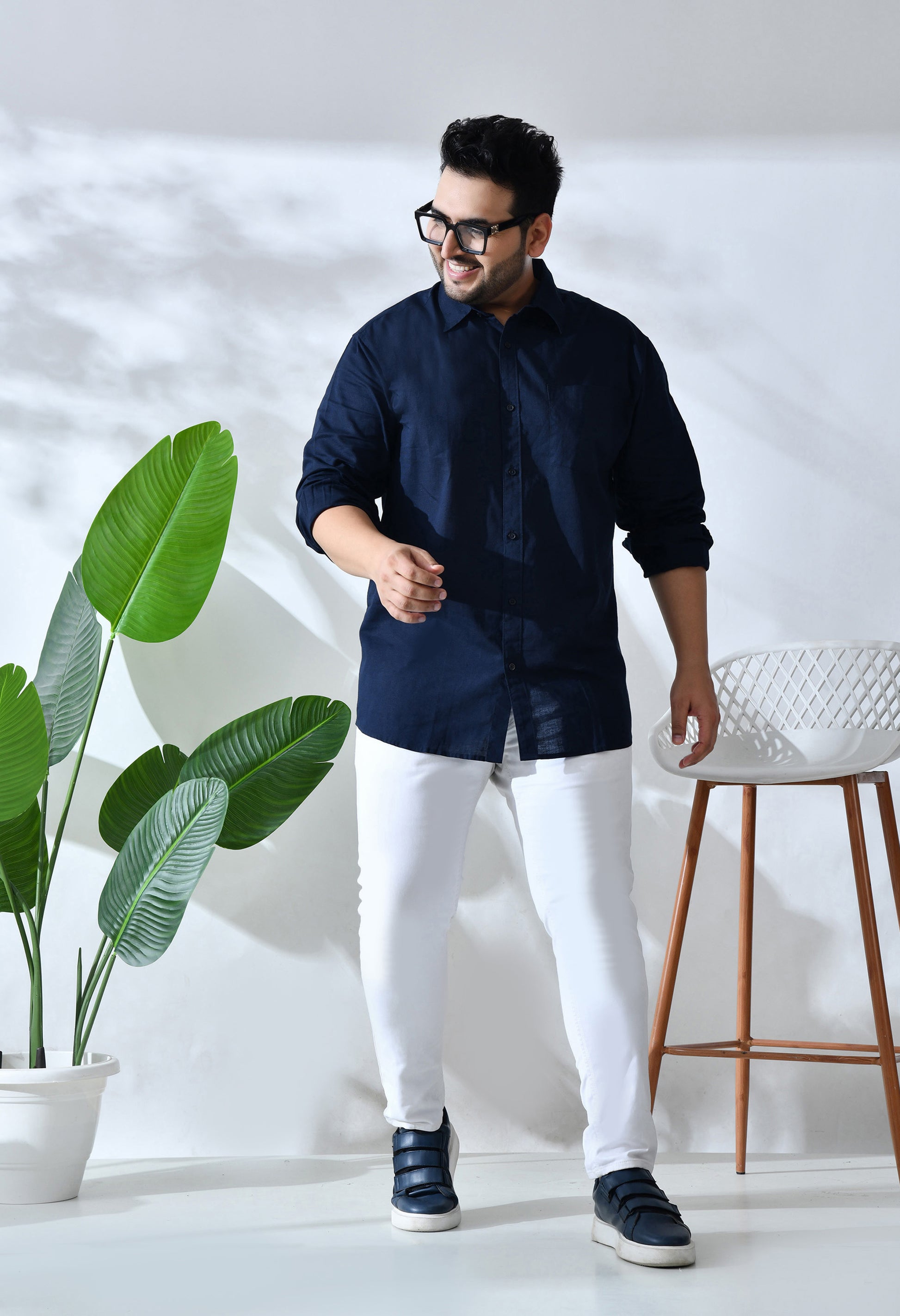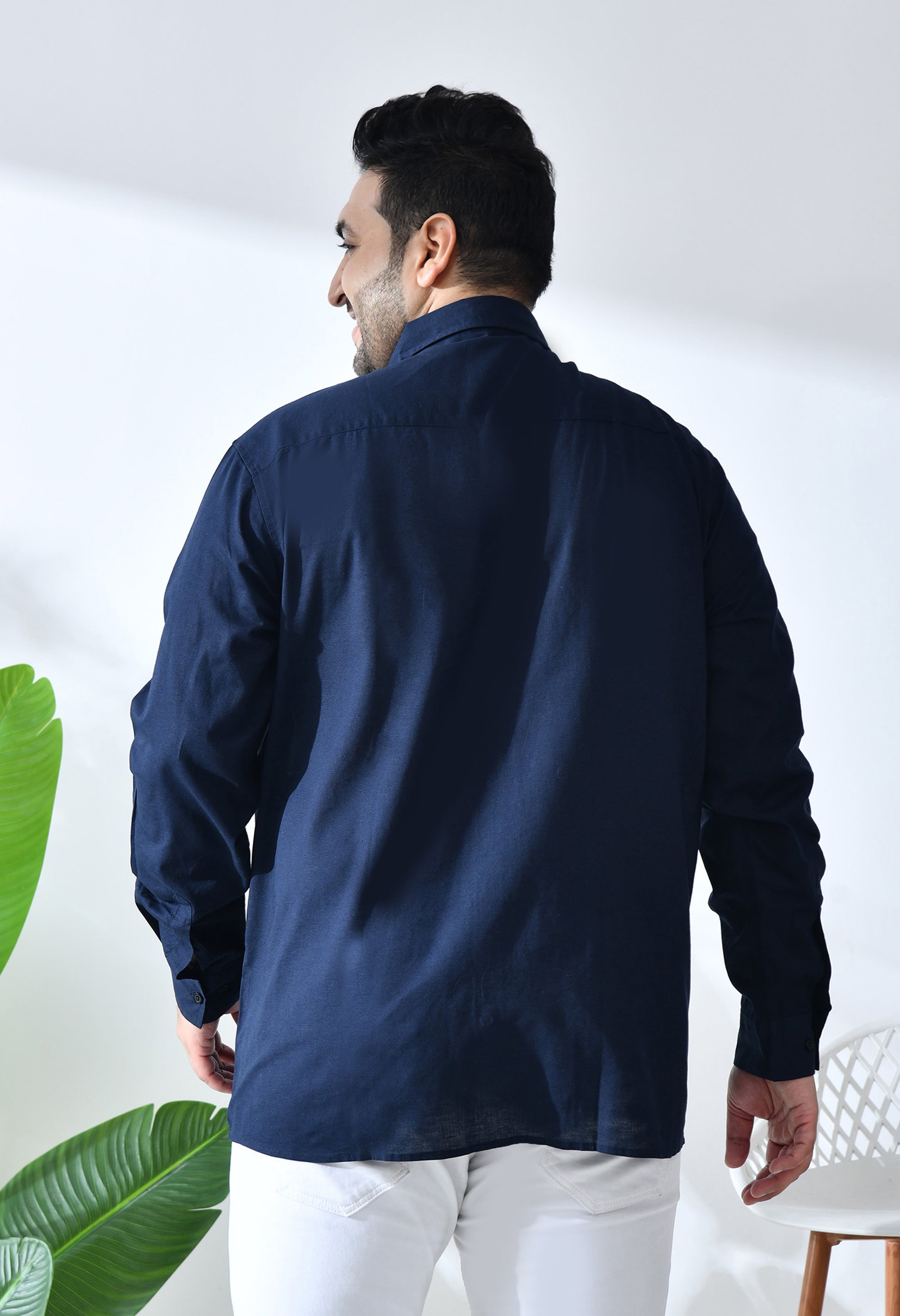 Men Cotton Linen Navy Blue 1 Pocket Solid Color Regular Fit Smart Casual Shirt (Style Code-2k20)