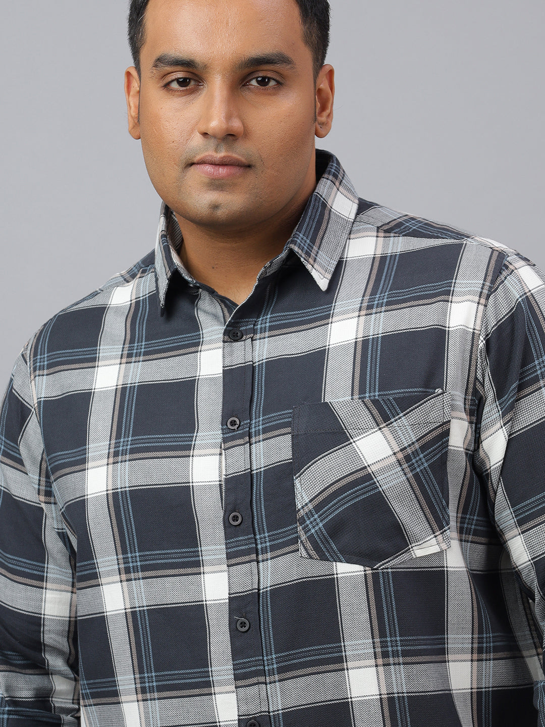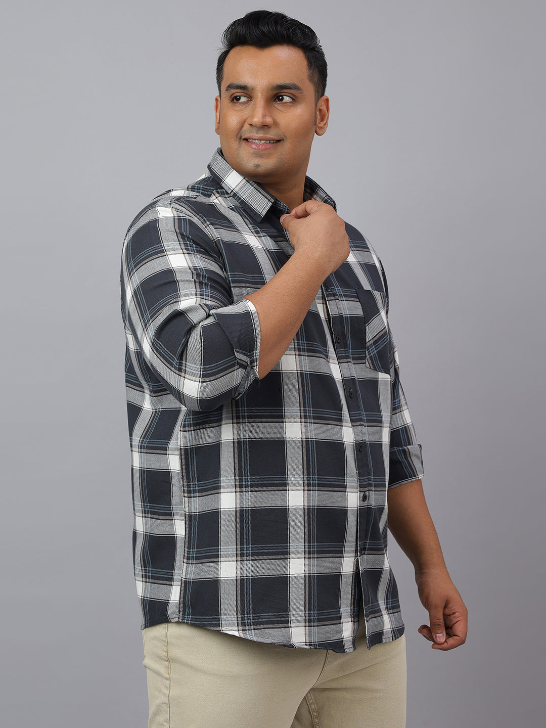 Men Grey, White and Blue Cotton Checks 1 Pocket Slim Fit Casual Shirt