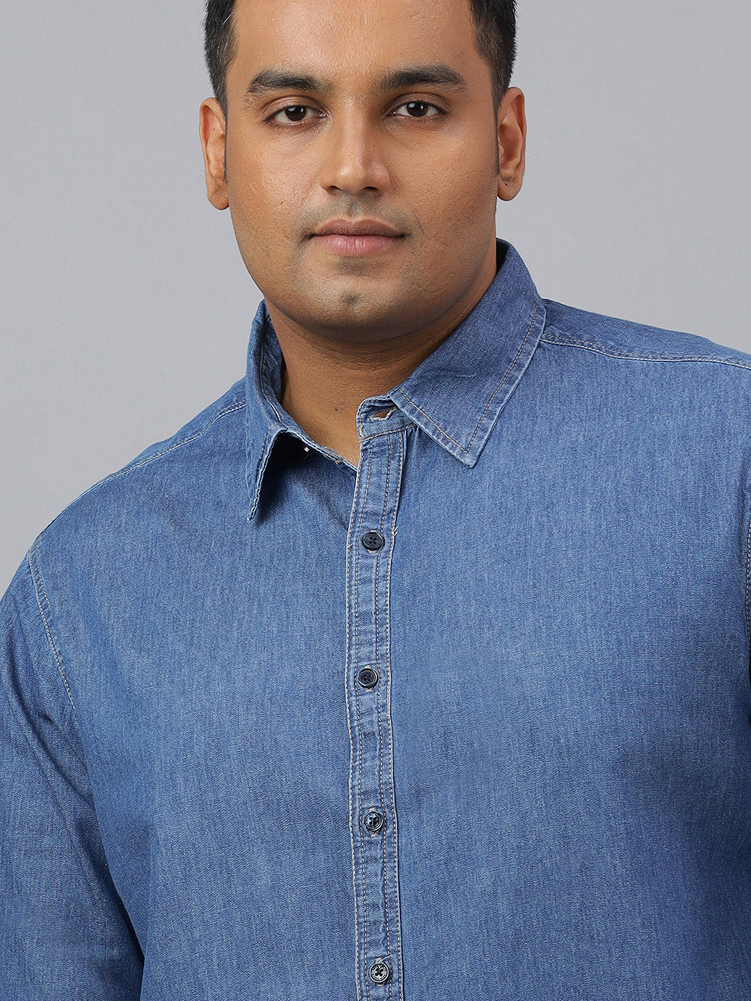 Men Dark Blue Indigo Cotton Denim Solid Color Slim Fit Casual Shirt